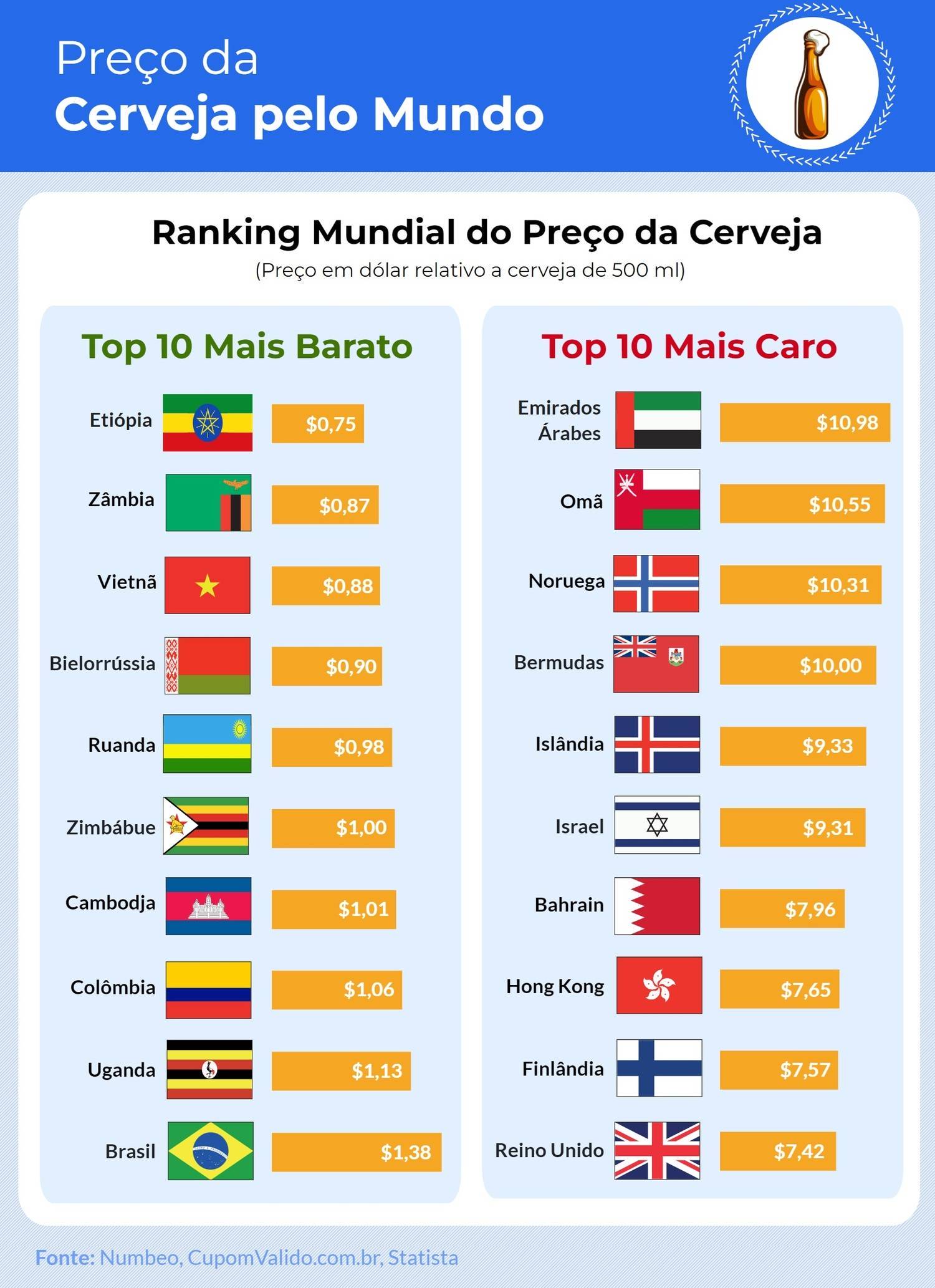 Os brasileiros desembolsam cerca de R$ 13,25 (US$ 2,76) para comprar 1 litro de cerveja, valor 66% menor do que a média mundial, de R$ 8,12 (US$ 38,98). A diferença entre os preços coloca o Brasil como o país com o 10º menor custo para consumir a bebida, segundo estudo da plataforma Cupom Válido feito com 196 nações.