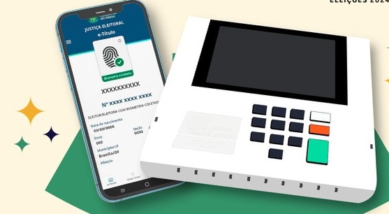 Pra todos verem: imagem com urna eletrônica e ao fundo um telefone com E-titulo